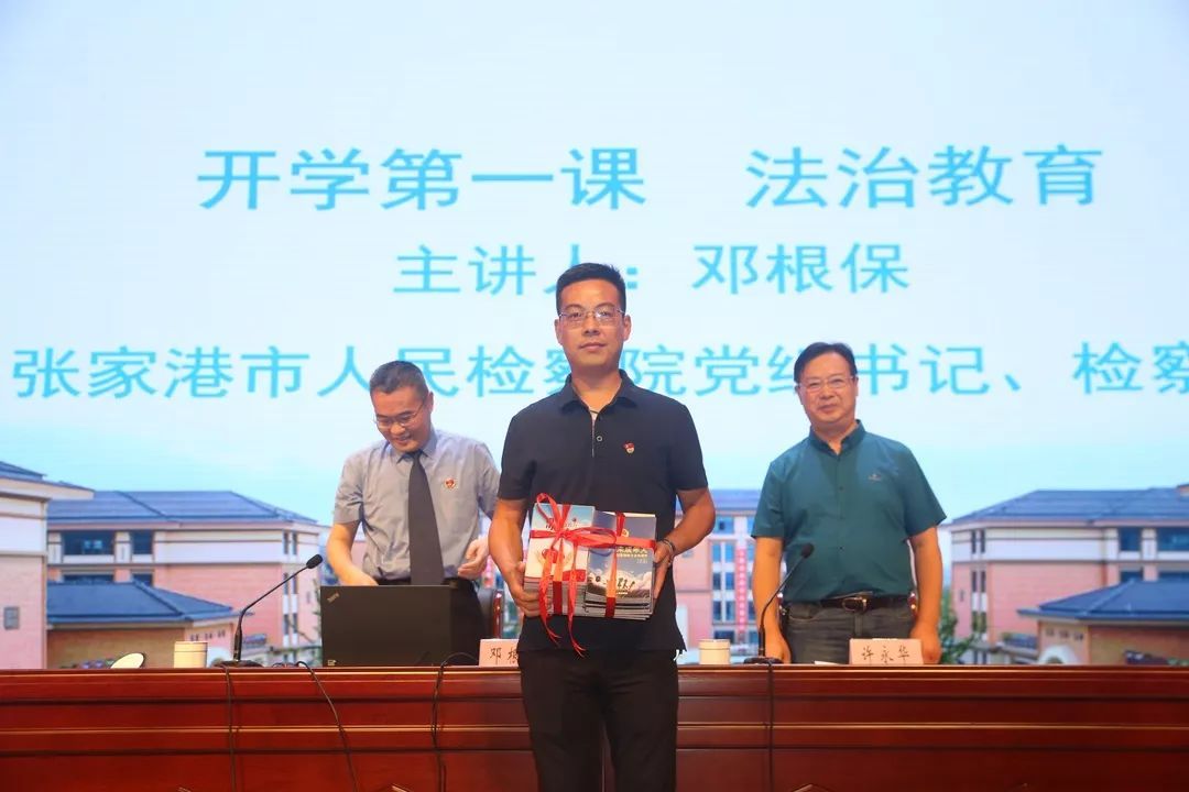 在讲座的最后,他也把送给同学们的开学礼物——一套未成年人普法材料交至我校领导手中。
