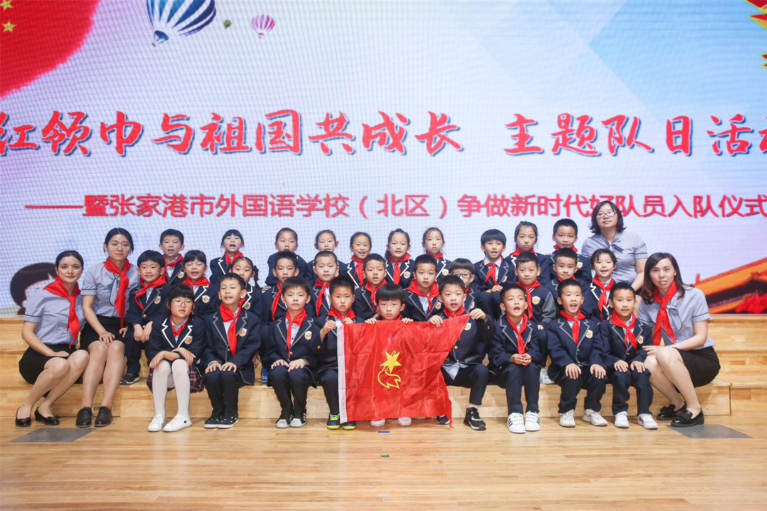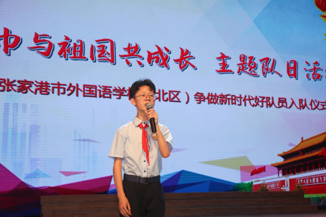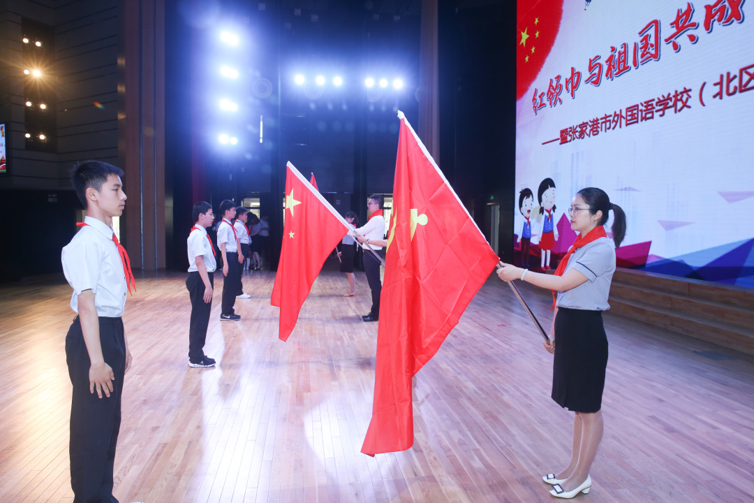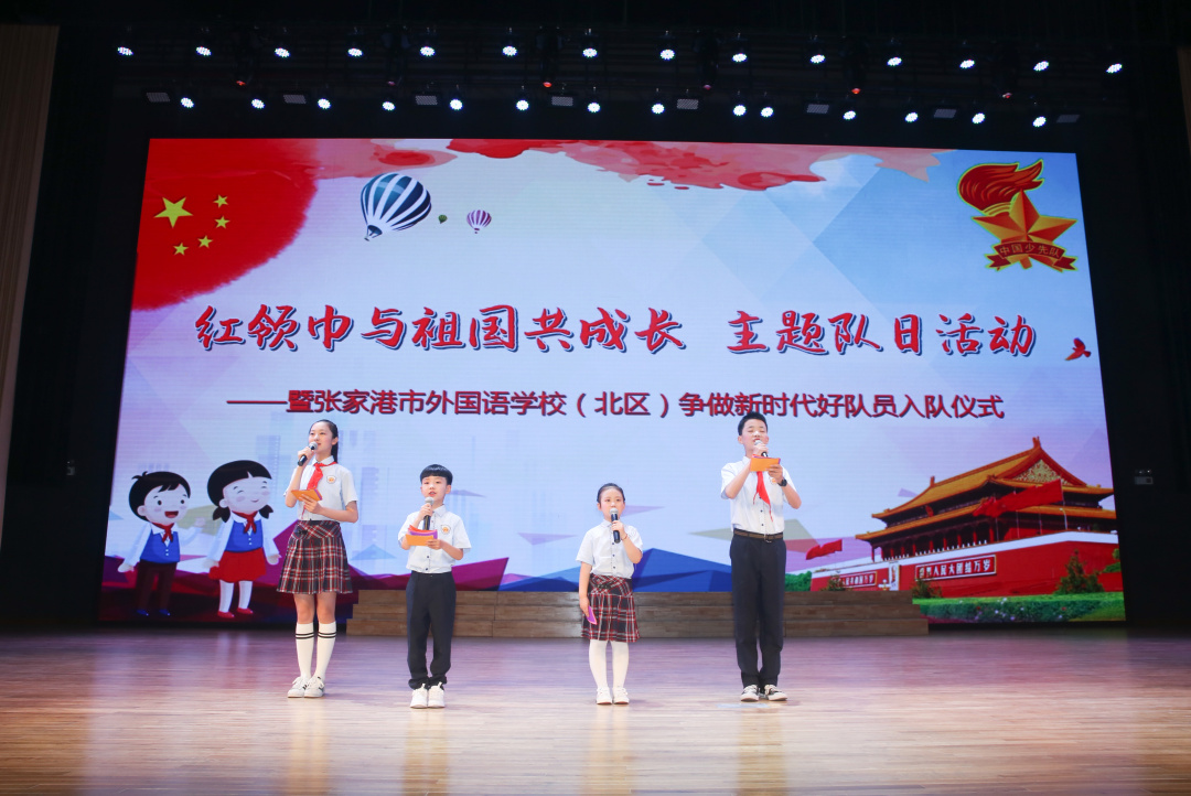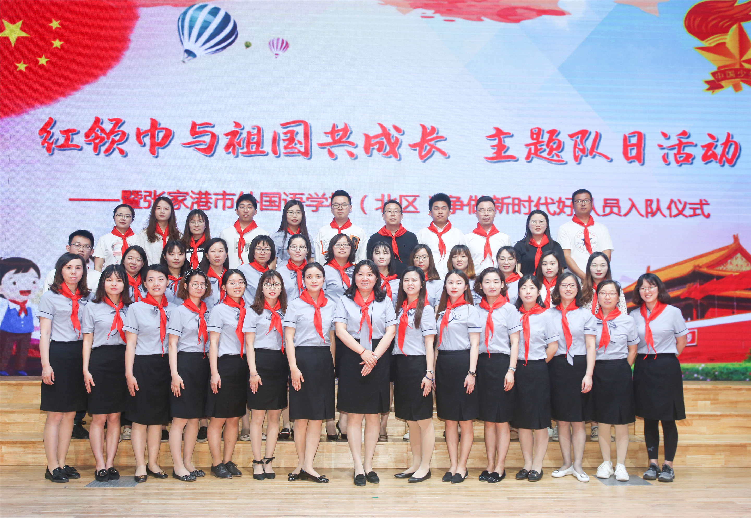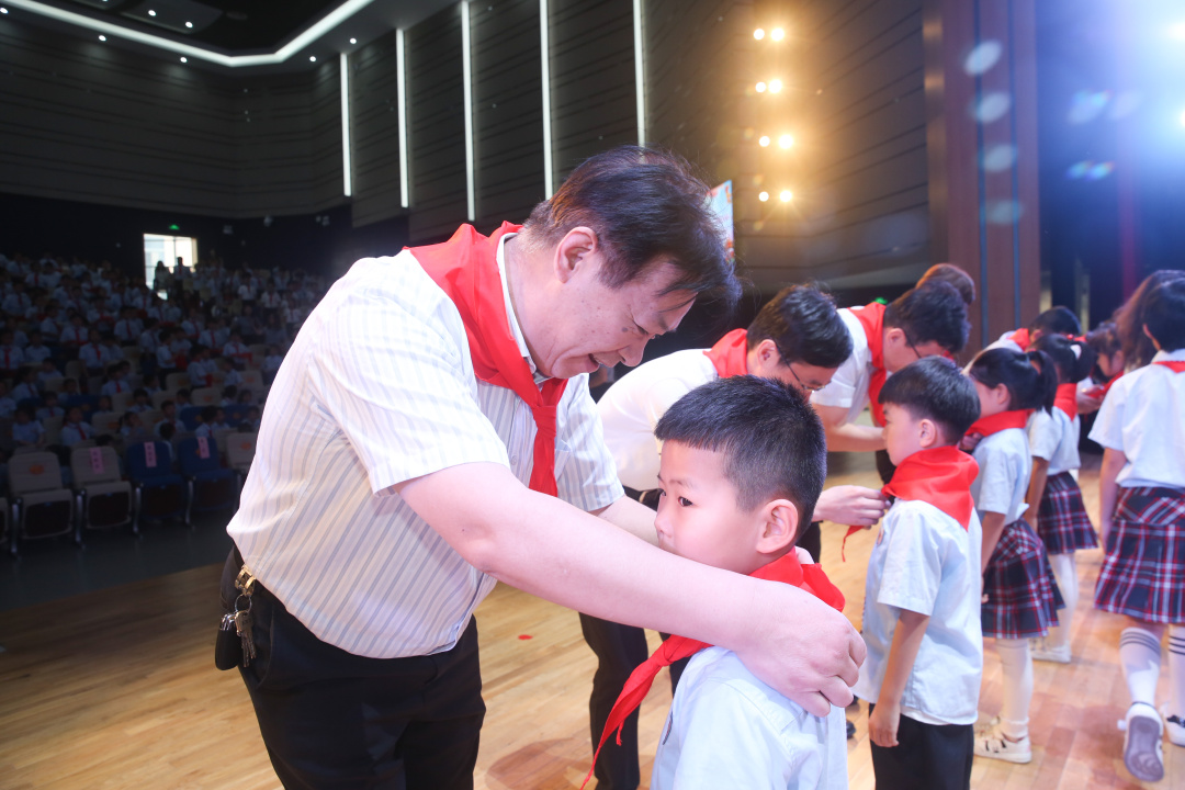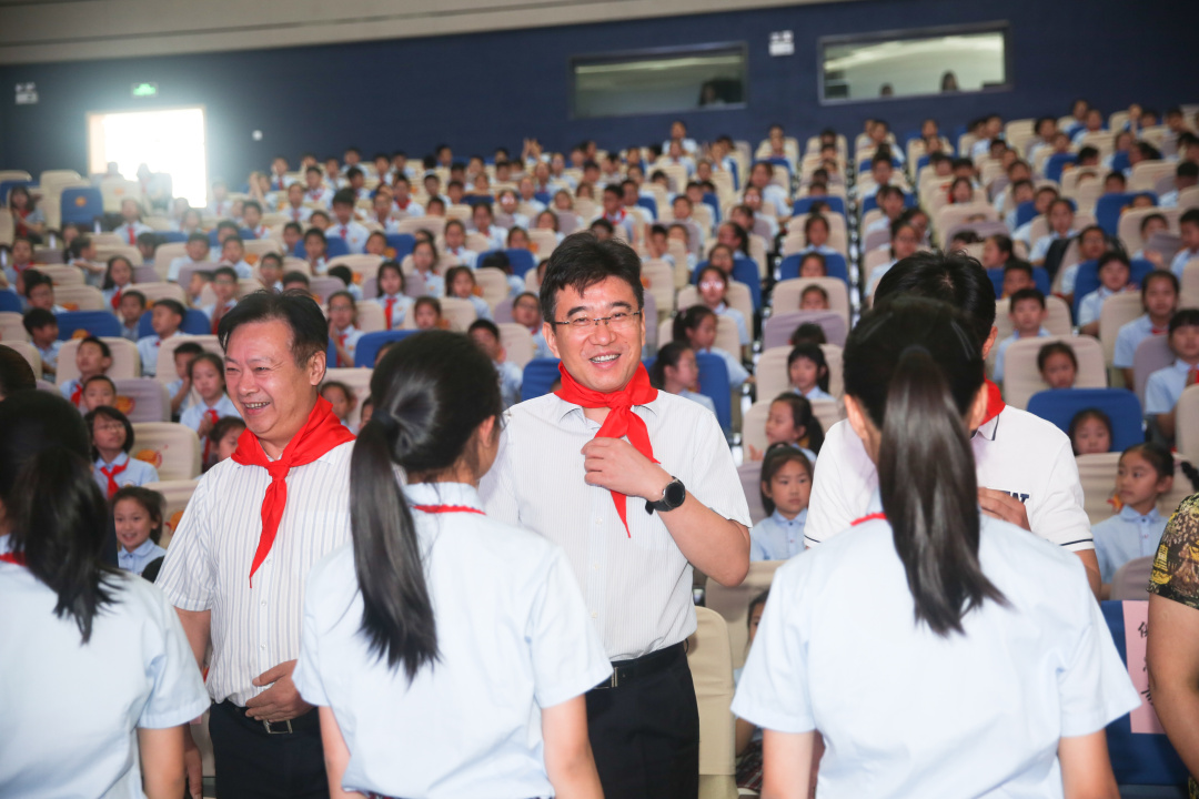 张家港冶金工业园(锦丰镇)党委书记常征、党委副书记、镇长沈晓波、张家港外国语学校校长许永华等领导惊喜莅临仪式现场,看望慰问师生,向新入队队员带来了祝贺和节日的问候。少先队员代表为领导们系上了红领巾。