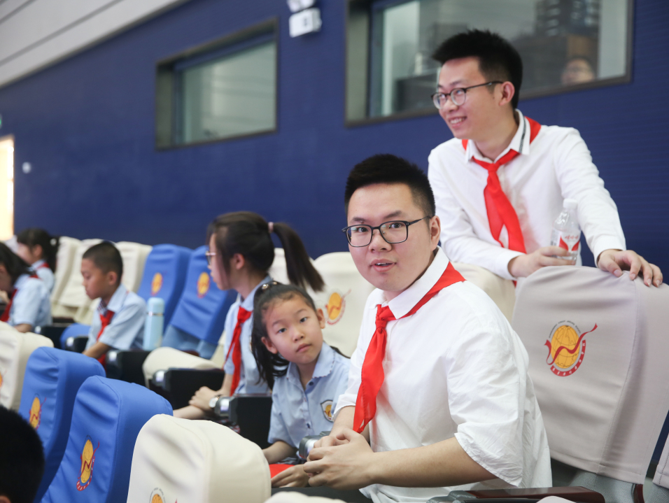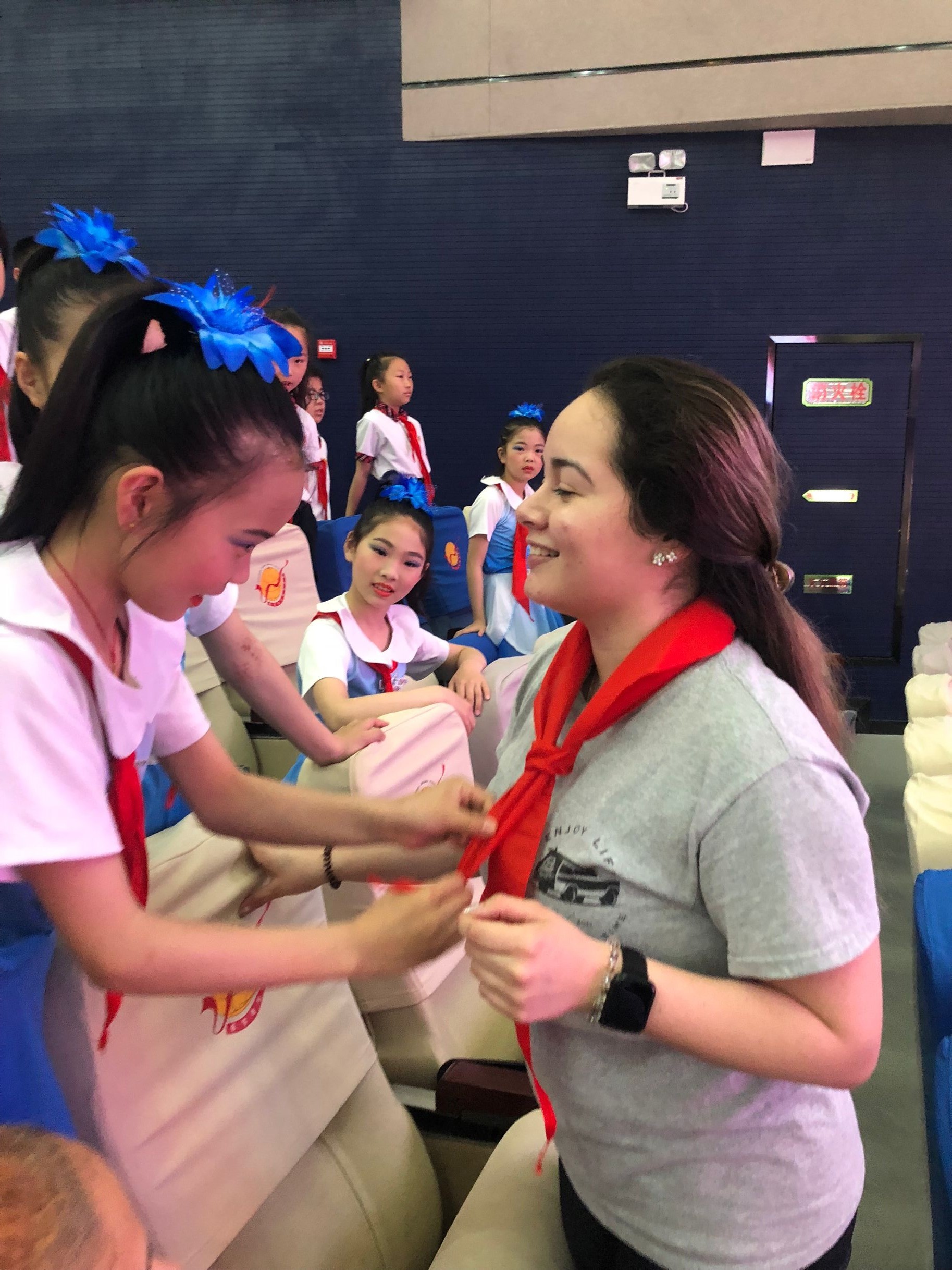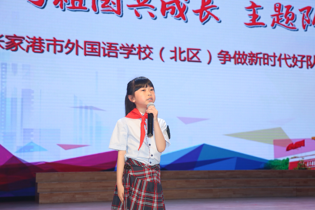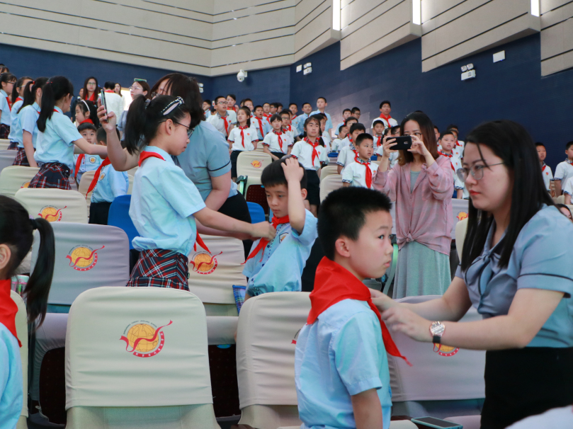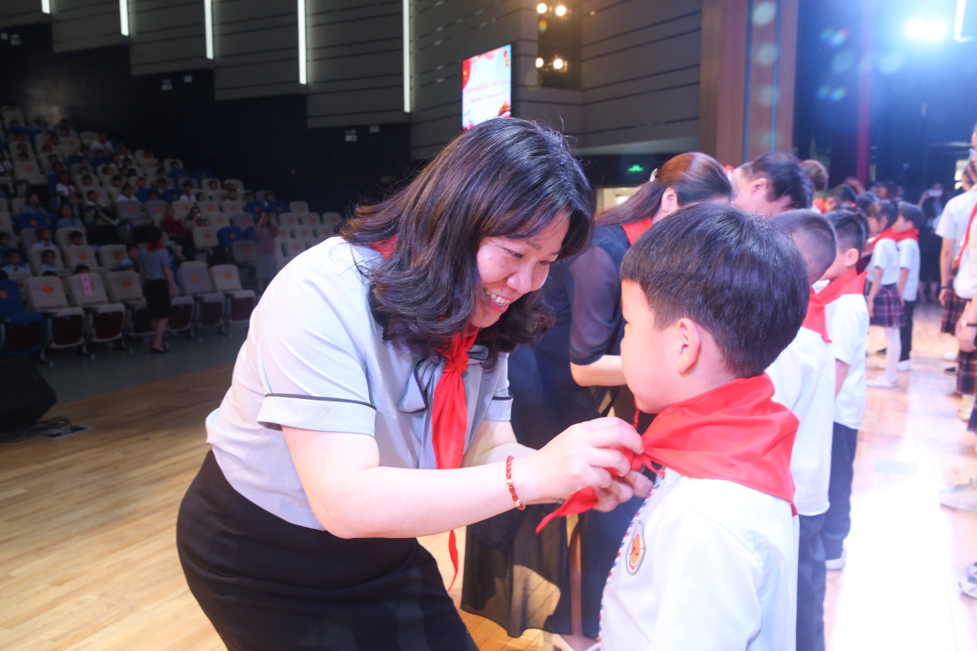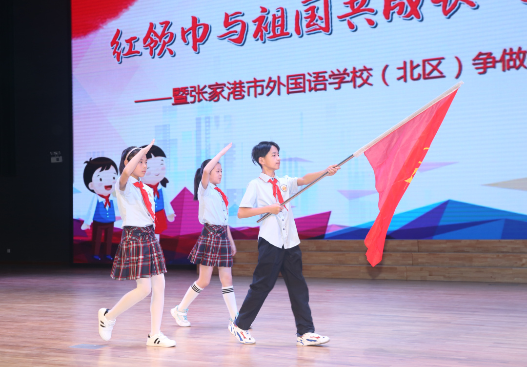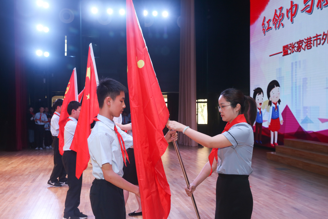 张家港冶金工业园(锦丰镇)党委书记常征、党委副书记、镇长沈晓波、张家港外国语学校校长许永华等领导惊喜莅临仪式现场,看望慰问师生,向新入队队员带来了祝贺和节日的问候。少先队员代表为领导们系上了红领巾。