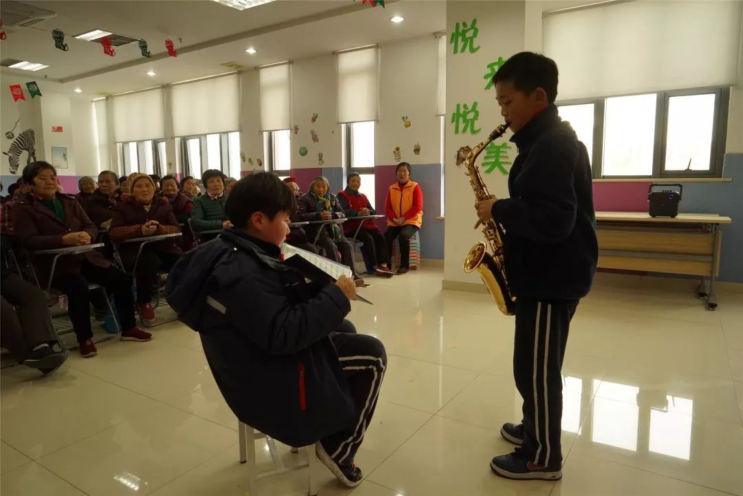 孩子们发挥特长,为老人们带来了一台精彩的演出:有吉他弹唱《晴天》《春天》、歌曲《奔跑》《燃烧我的卡路里》《Just like this》、二胡独奏《赛马》、古筝独奏《春天来了》、萨克斯独奏《大海》、脱口秀《1+1等于几》、相声《语言艺术》、小品《学雷锋》等十多个节目。