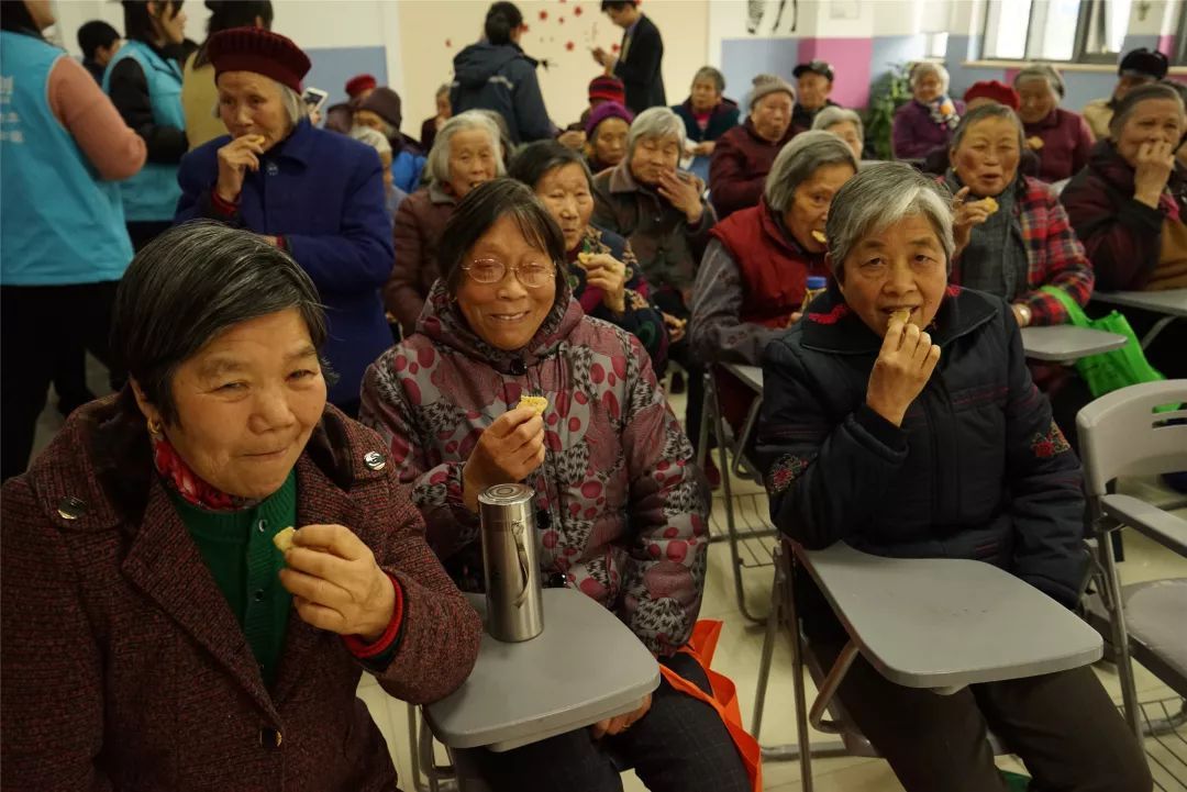 把烤好的饼干分给老人们尝一尝。