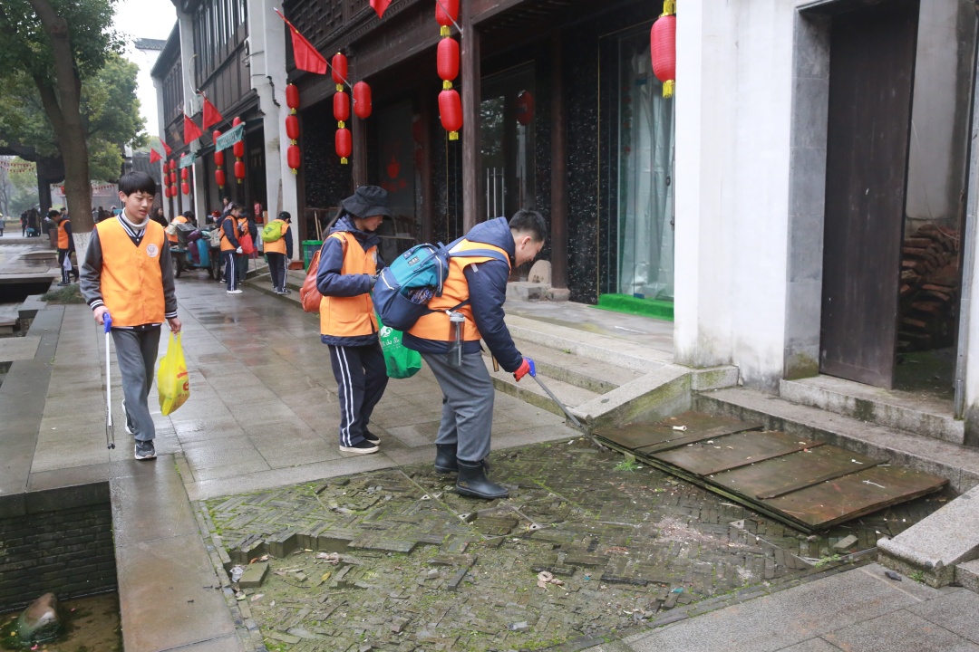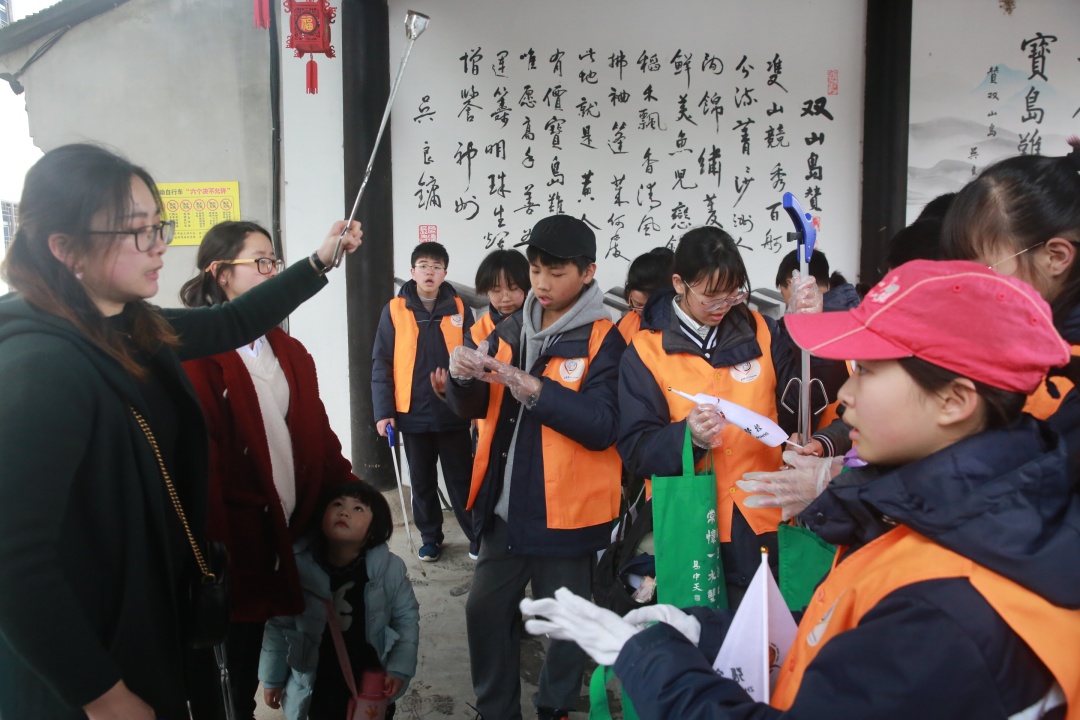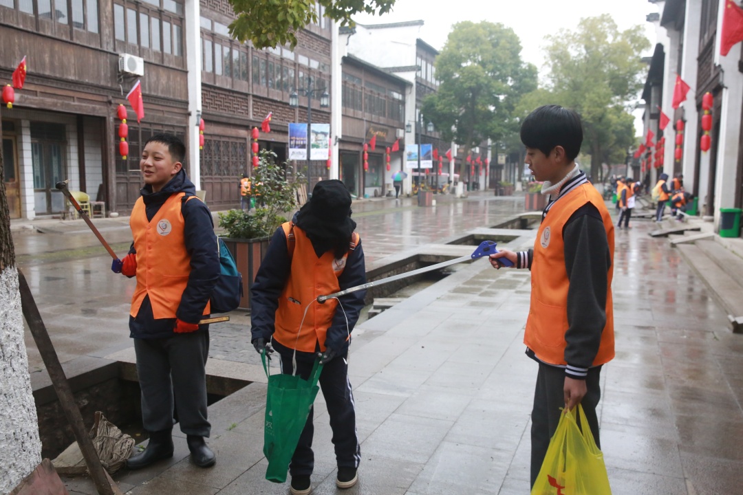 在这里同学们领取了工具——一副手套、一个捡拾钳、一个垃圾袋,他们立刻分散开来,三四人一组在老街和周边捡拾垃圾。