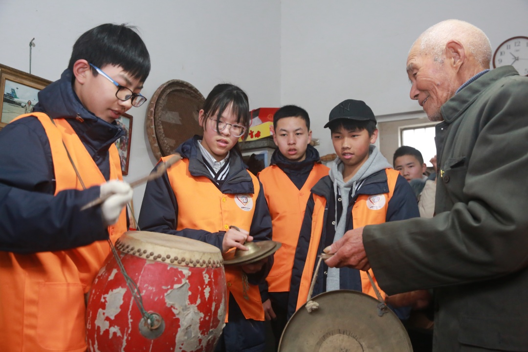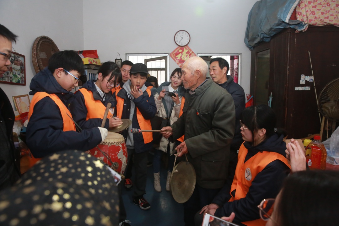 老同志还有一手“唱元宵”的手艺,孩子们来到家中,他高兴地教孩子们敲上几个节拍。同学们学得很认真,很快就敲得“像那么回事”了。