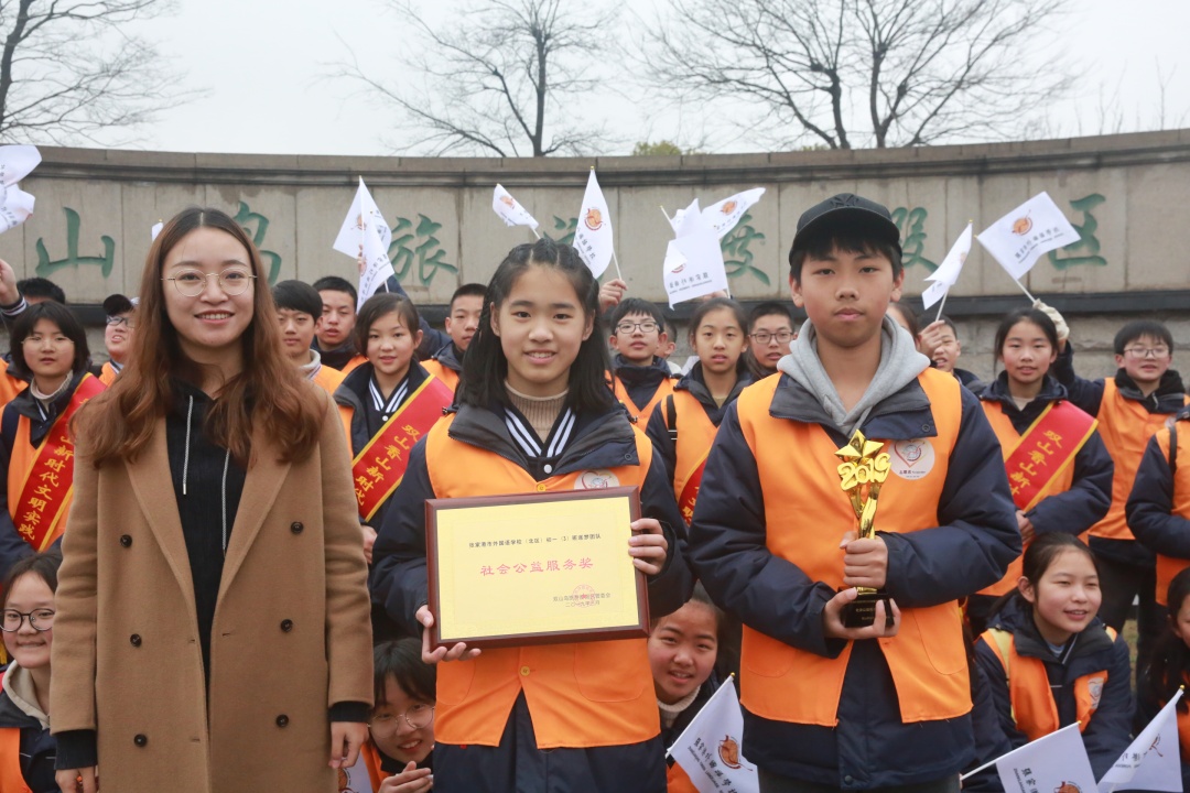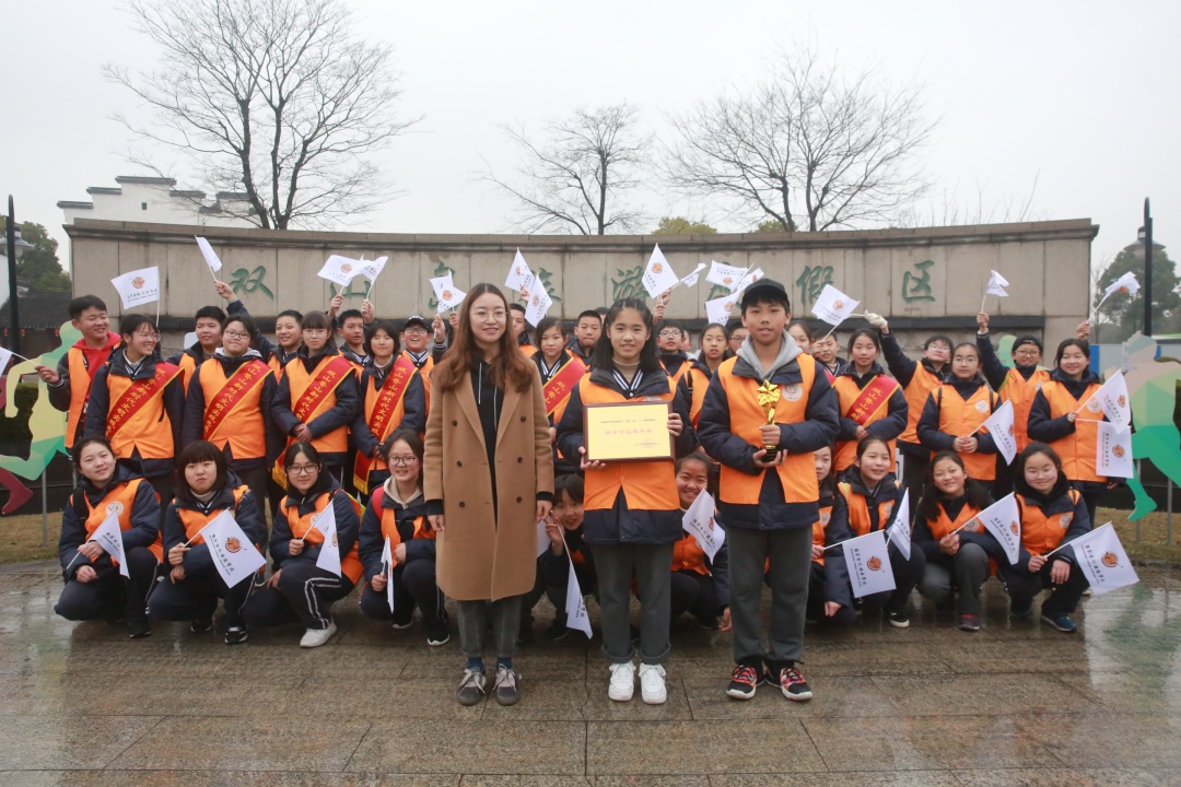 她向同学们颁发了“新时代文明实践志愿者”绶带、“社会公益服务奖”奖牌和奖杯,与志愿者们一起合影。同时她欢迎同学们,以及更多的班级来到美丽的双山岛服务、游玩。