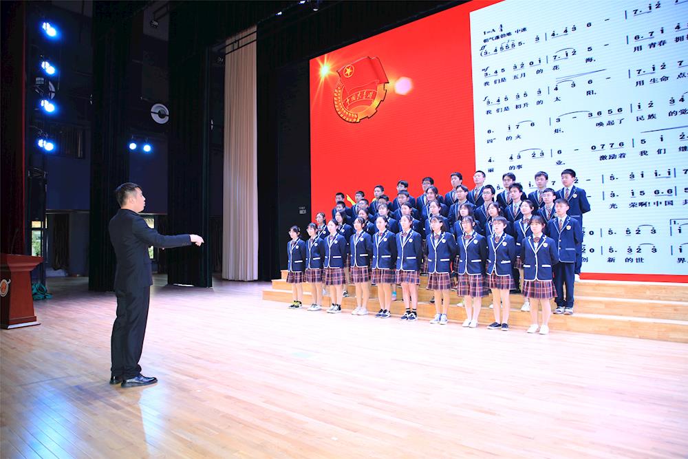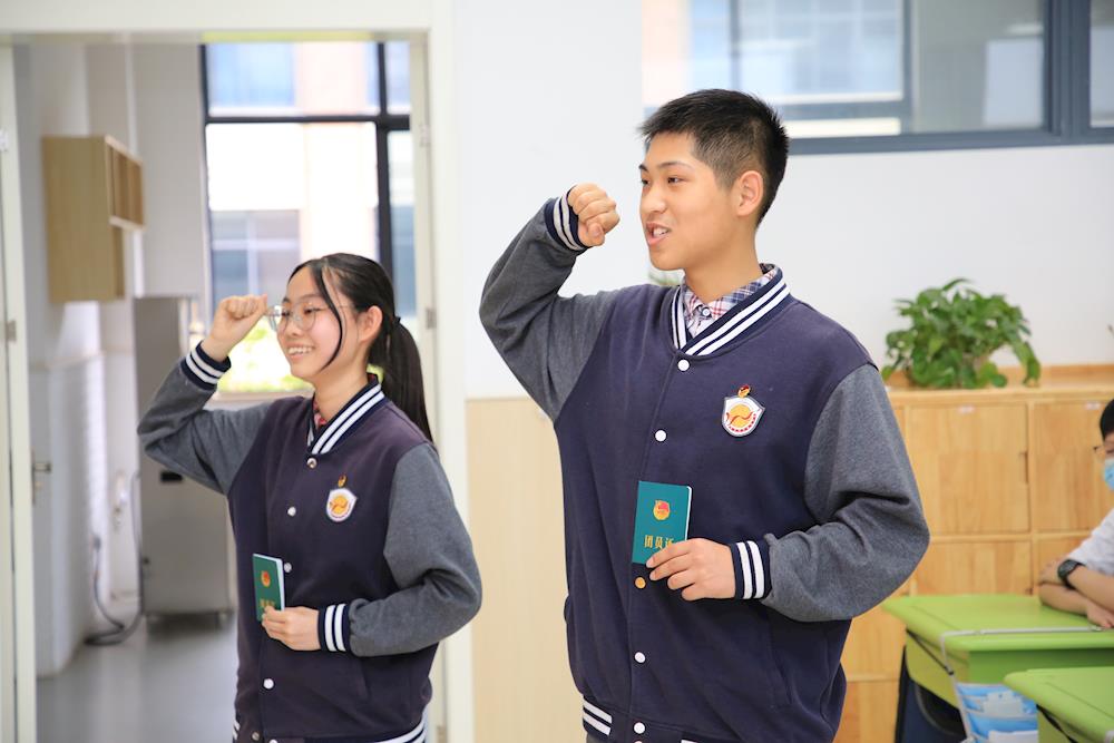 集体宣誓。青春誓词:我以青春的名义庄严宣誓:面对困难,我们勇于向前。面对挑战,我们毫不畏惧。面对挫折,我们绝不低头。面对失败,我们永不言弃。面对自己,我们不断超越。生命如虹,青春不悔。