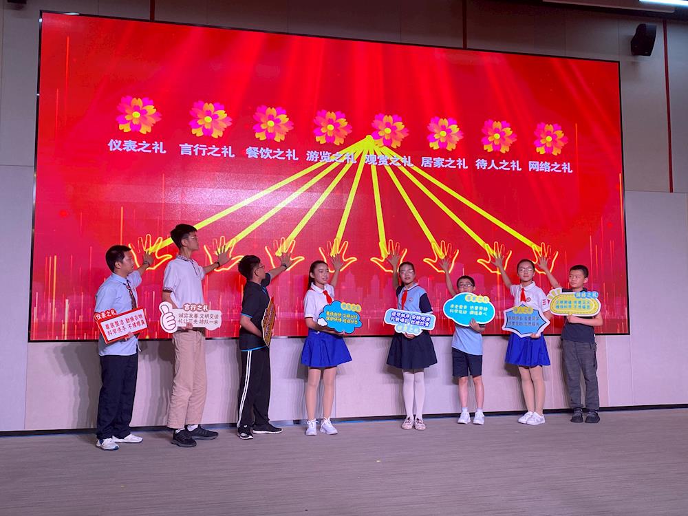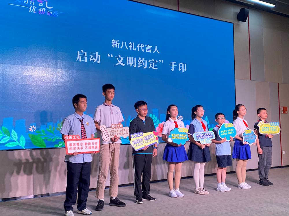 我校曾鑫扬同学(上图左一)与来自全市的美德少年代表们作为“新八礼”代言人共同为活动大屏幕点亮启动手印。