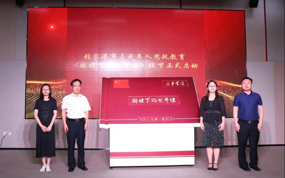 市委常委、宣传部部长朱艳,市委教育工委书记、市教育局局长杨志刚,市委宣传部副部长、文明办主任钱晓东,市文明办副主任王海燕共同启动未成年人思政教育《国旗下的公开课》线下活动。