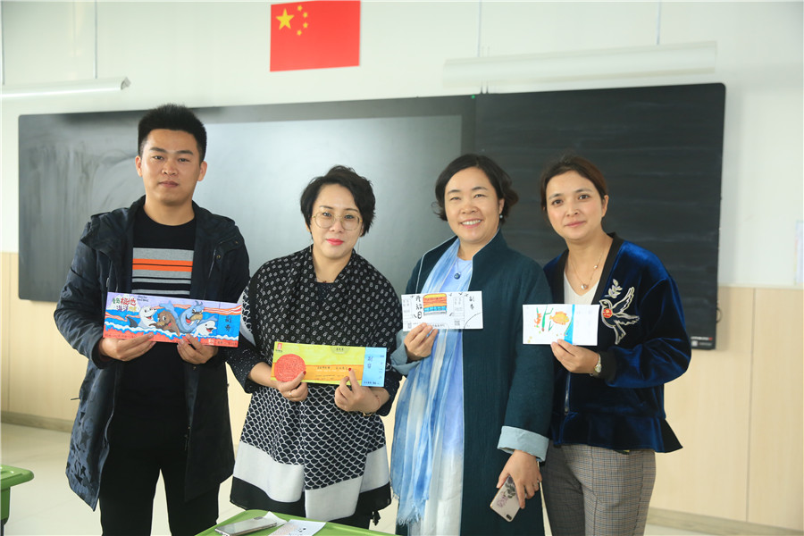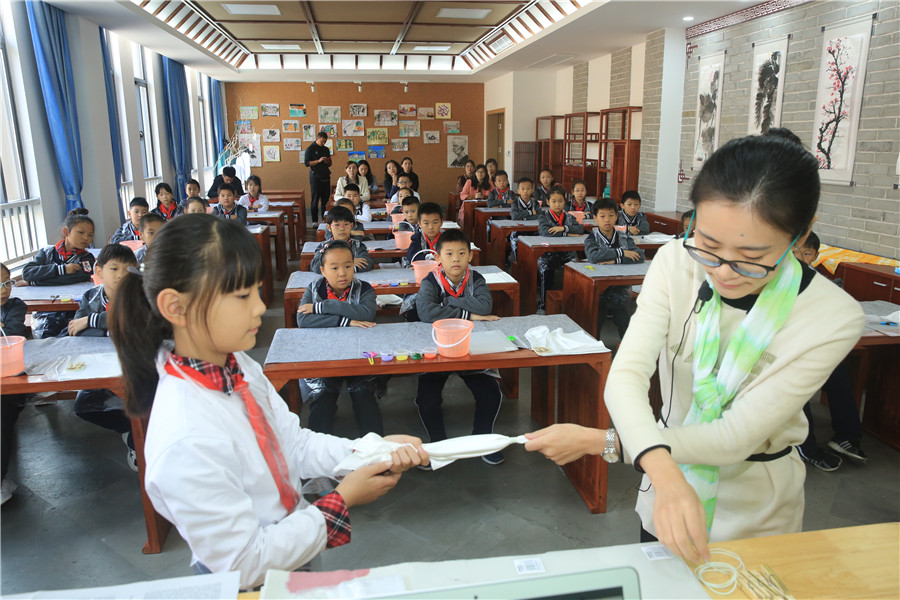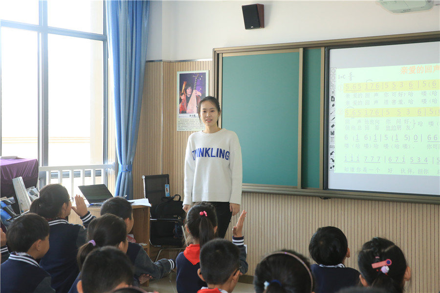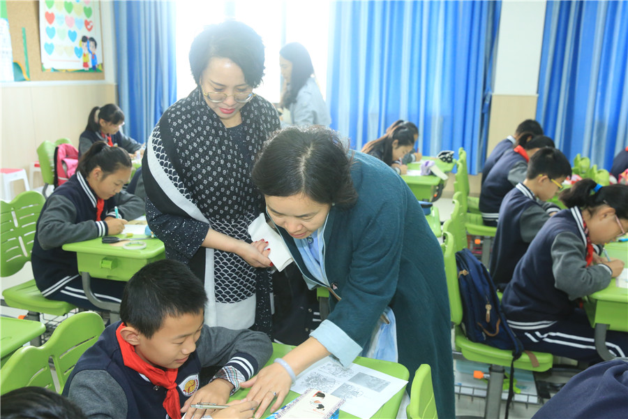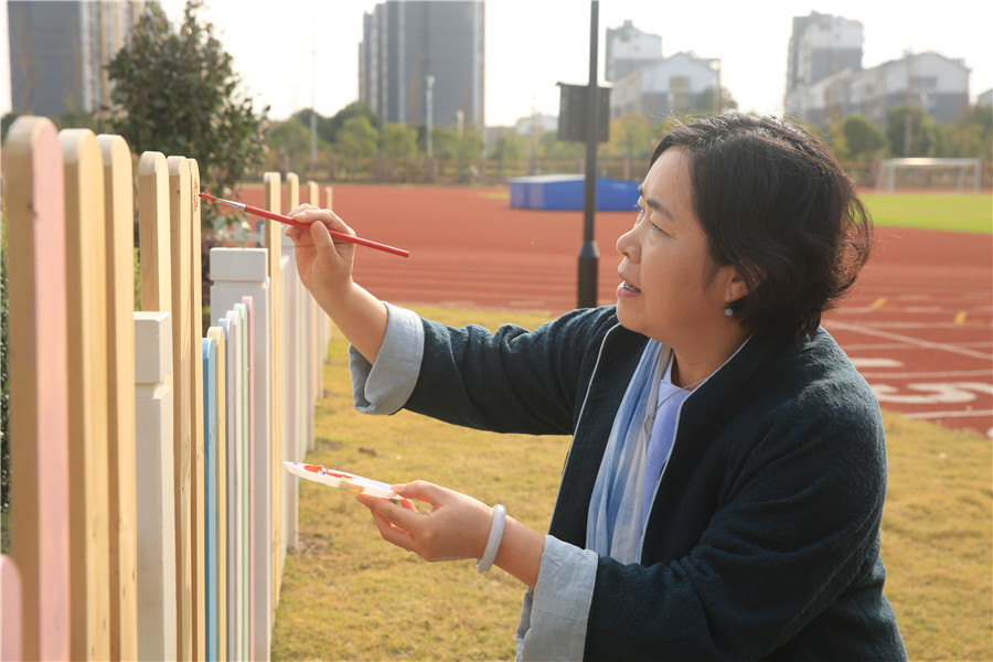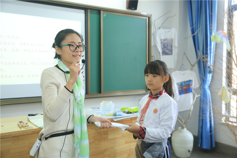 此次教研活动一共展示了五节课,全部是由未满三年的青年教师带来,分别是陈晨的一年级音乐《不能告诉你》、包禹婷的四年级音乐《亲爱的回声》、潘俊杰的六年级美术《参观券的设计》、顾崇嘏的六年级美术《市井人物》和蔡晶的四年级美术《秋意之巾-色彩的扎染》。几名老师准备充分,个个身怀绝技:潘老师展现了高端大气的高科技纳米黑板的实用;顾老师用了清明上河图作为整堂课的串联,展示了一个个生动鲜活立体故事人物;蔡老师通过扎染的方法呈现了一堂充满诗意的课堂,把学到的方法真正的运用到生活中去;音乐陈老师、包老师用生动活泼的语言、丰富多彩的教学手法以及师生之间轻松的互动为我们呈现了一堂充满魅力的音乐课堂。9时整,许文琴副校长带领大家来到小花园,给栅栏涂上了五彩斑斓的花卉、音符等装饰。