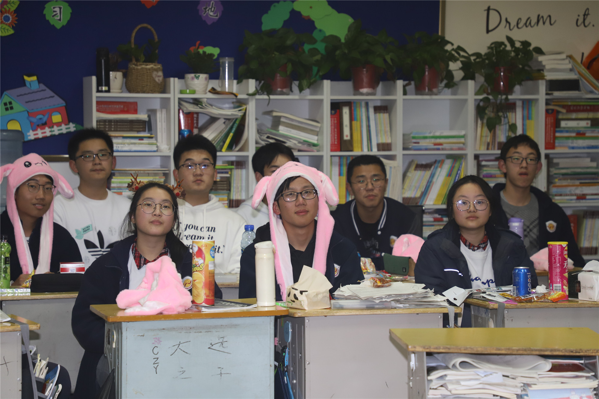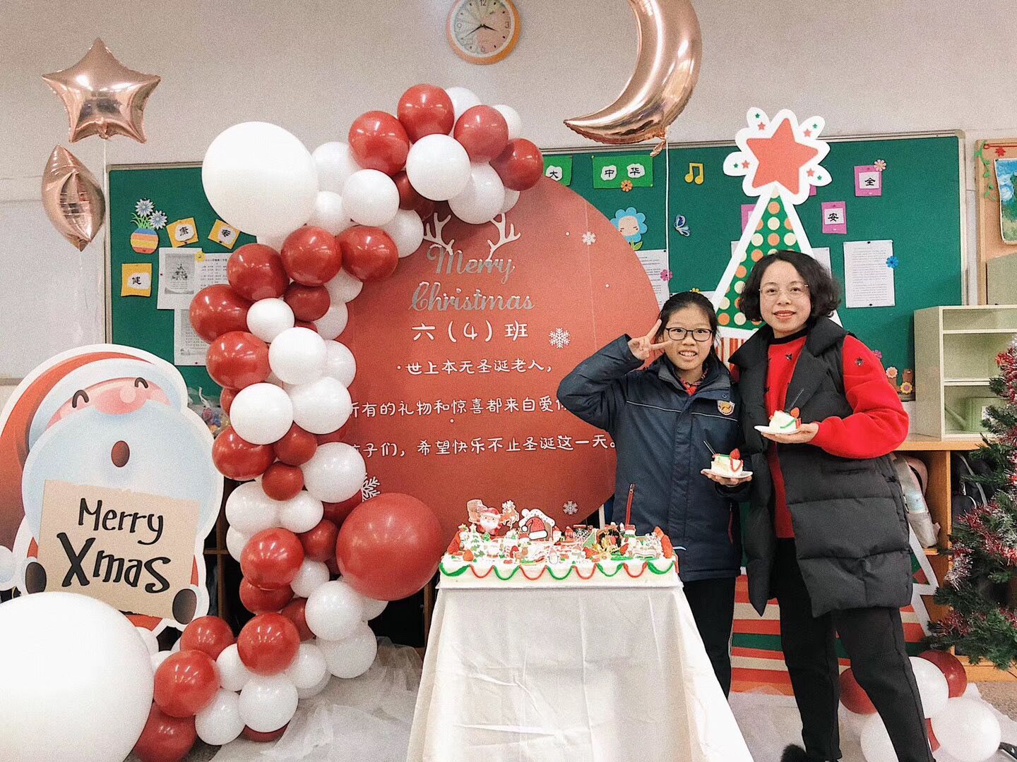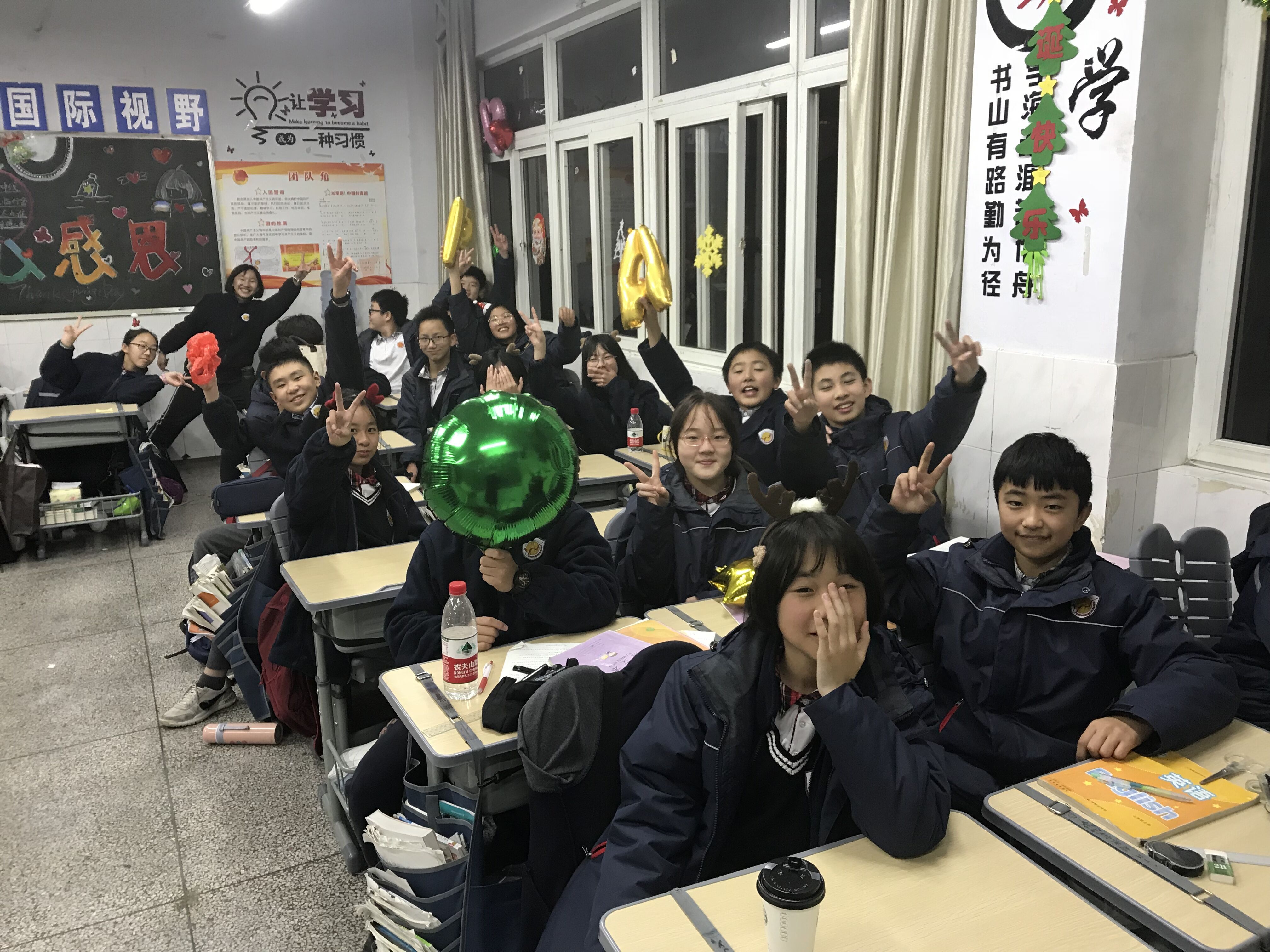 教室里挂满了五颜六色的气球,