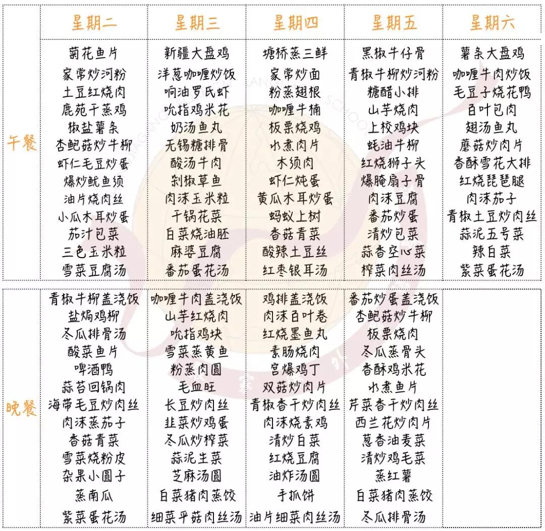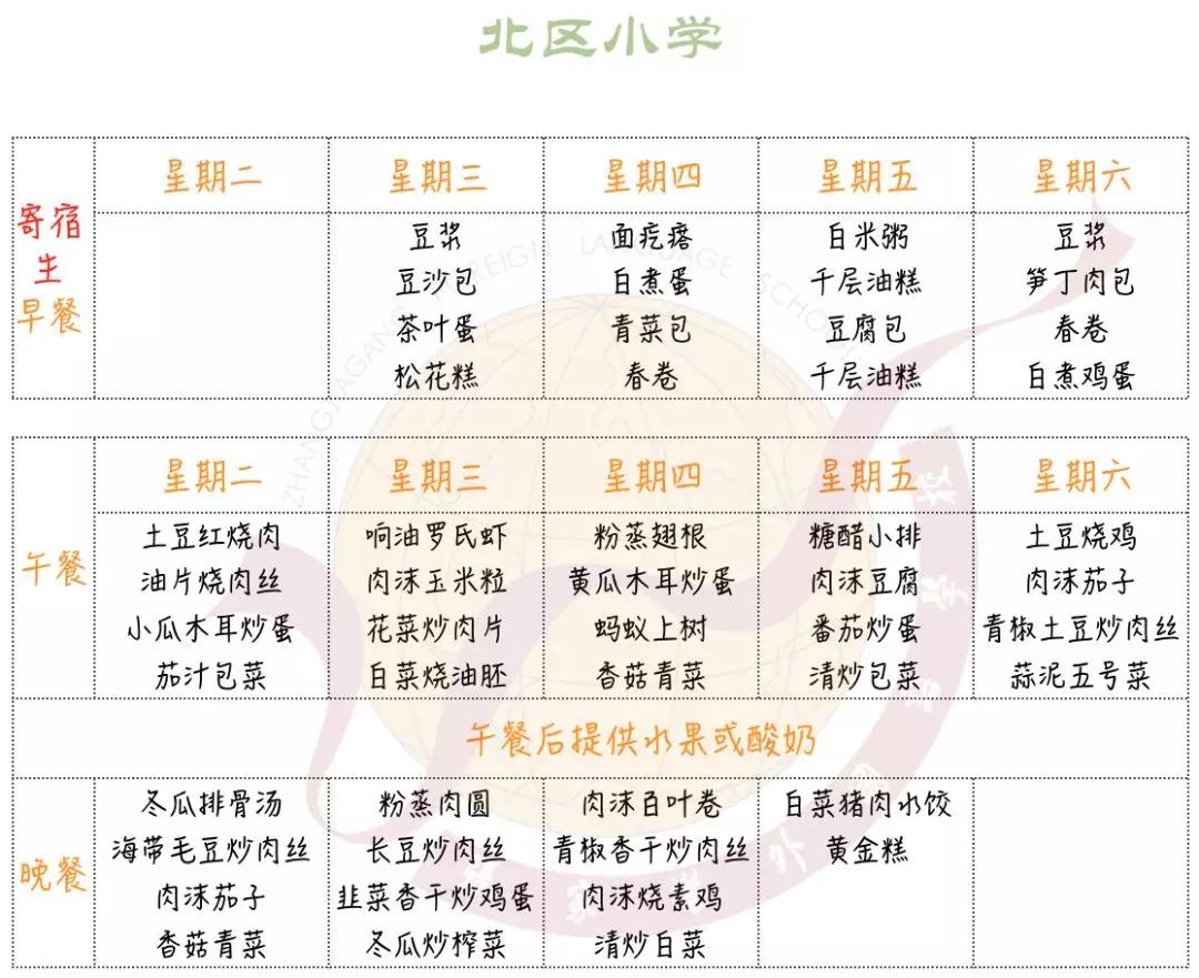 张家港外国语学校(北区)19-20学年第一学期第6周(10.8—10.12)学生菜单公示 来源: 发布时间:2019-10-07 07:38:09 浏览次数: 次 【字体:小 大】 分享到: 【打印正文】