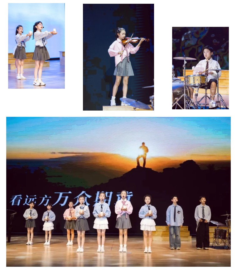当记忆的画卷轻轻合拢,一曲《向阳而生》点亮舞台。何奕博的钢琴,是晨露滋润的绿芽,岳欣纯的小提琴,是风中摇曳的花枝,姜楠的架子鼓,是大地有力的心跳……而六(1)班的八位小伙伴,用跃动的舞步和清亮的歌声,为这支生命的交响曲,注入最灿烂的阳光能量!